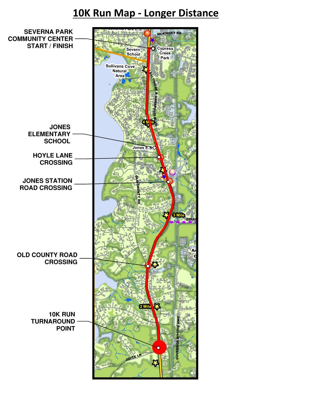 The 10K starts and ends at the Severna Park Community Center. Runners cross Baltimore Annapolis Blvd to the B&A Trail, follow it to the turnaround point, then head back to finish at the Community Center—where the post-race celebration awaits! Strollers and pets welcome.